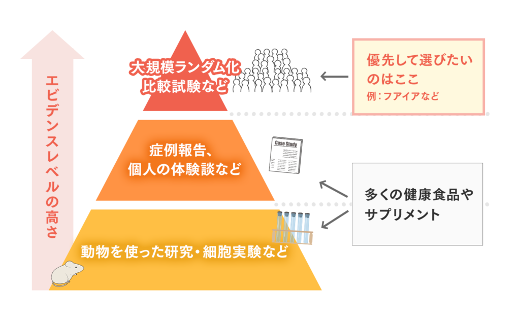 エビデンスにはランクがあります。 多くの健康食品は「細胞や動物での実験」レベルですが、それは本当に人間で効果が得られるかはまた別問題のため、エビデンスレベルとしては一番低いもの。